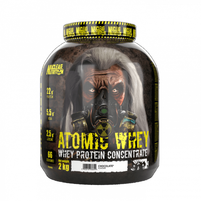 ATOMIC WHEY. With sweeteners. Whey protein concentrate powder for preparing high protein shakes. ATOMIC WHEY is designed for athletes and physically active people with a higher demand for proteins. Protein contributes to a growth in muscle mass.