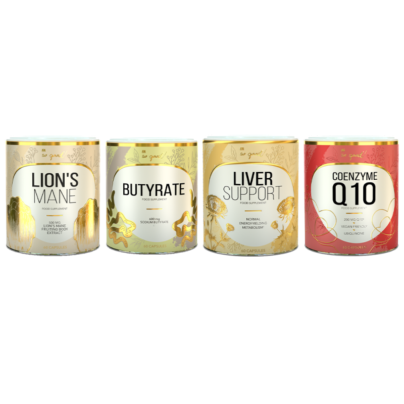The So Good HEALTH AND VITALITY SET consists of: so good!® Lion`s mane 60 capsules, so good!® Butyrate 60 capsules, so good!® Coenzyme Q10 Ubiquinone 200 60 capsules and so good!® Liver Support 60 capsules.