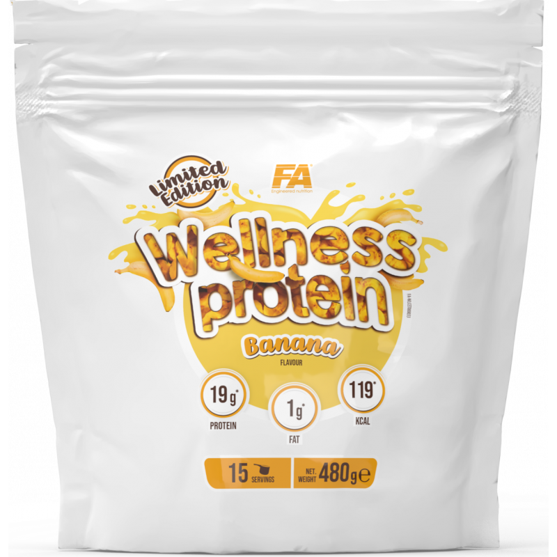 Wellness Protein. With sweeteners. Powder for preparing protein shakes. Protein contributes to a growth in muscle mass. Banana flavour.