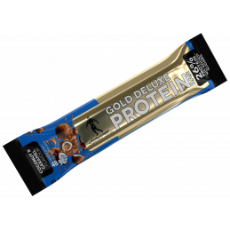 GOLD DeLuxe Protein Bar. Baton proteinowy w czekoladzie mlecznej bez dodatku cukrów z nadzieniem arachidowym i nadzieniem o smaku karmelowym z orzeszkami arachidowymi. Zawiera substancję słodzącą.
