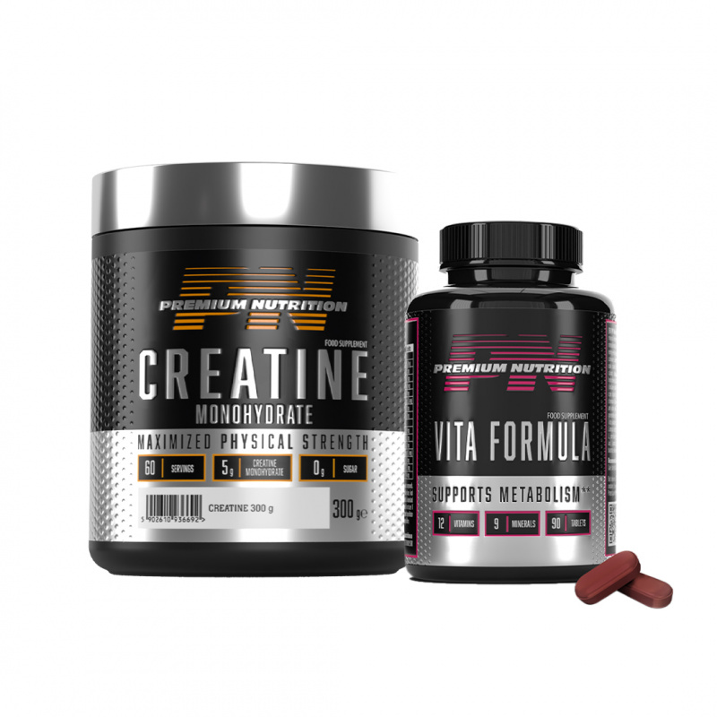 Zestaw PREMIUM składa się z: PREMIUM NUTRITION Creatine monohydrate 300 g oraz PREMIUM NUTRITION Vita Formula 90 tabs